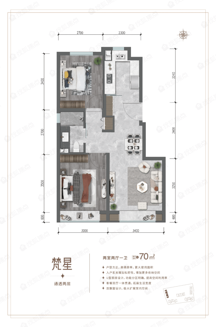 这个户型是东西向,户型全明通透,空间布局还算不错,主卧面宽3米,客厅面宽3.4米,一梯两户。K a 0 ] ; v {