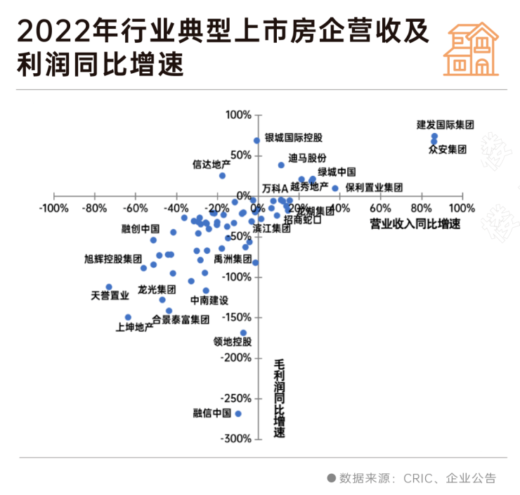 2022年在行业典型上市房企中,仅有约25%的企业实现营收增长。