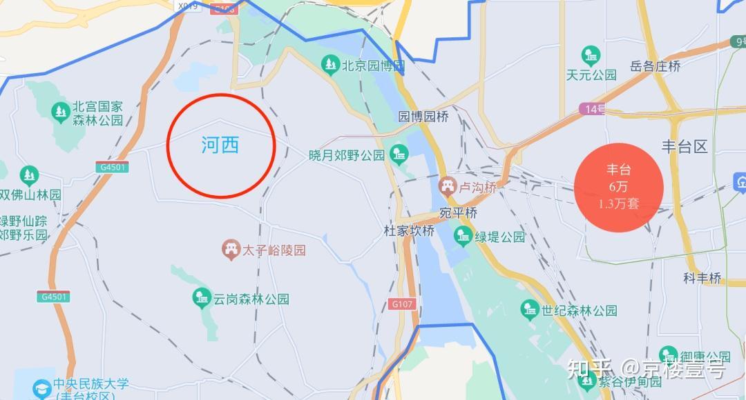 河西又属于丰台发展中更滞后的那种。看下图可以发现河西板块,一是有河这个天然屏障相隔,二板块内不通地铁。