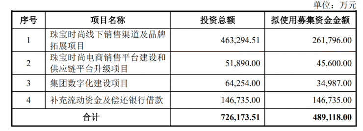 本次发行募集资金拟投资于珠宝时尚线下销售T 8 A X渠道及品牌拓展项目、珠宝时尚电商销售平台建设和供应链平台升级项目、集团数字化建W # s o M设项目以及补充流动资金及偿还银行贷款。