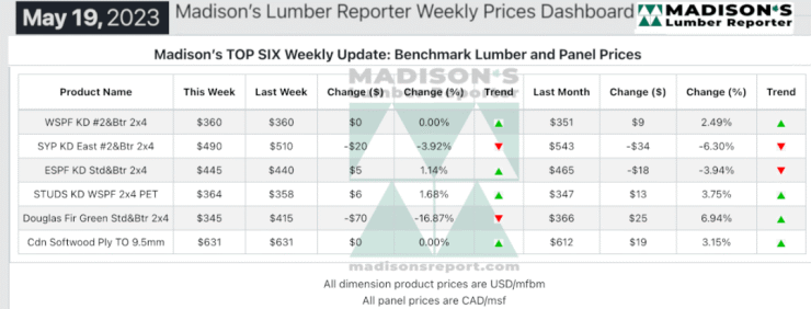 以下是Madison’s报告六大基准尺寸软木材和面板价格: