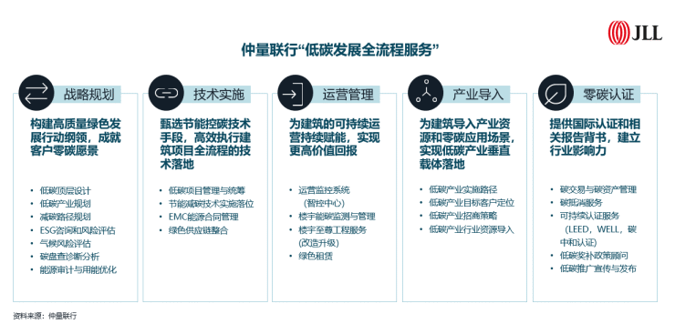 4、 低碳产业导入。除了建筑载体的低碳化更新,植入绿色内核是楼宇建立核心发展驱动力的关键抓手。仲量联行围绕低碳产业定位与实施、目标客户定位、招商运营策略构建、行业资源整合等服务,助力客户及城市构建低碳全产业链,实现低碳产业垂直载体落地。