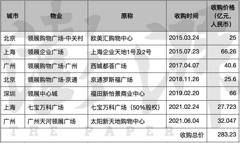 根据领展此前发布的公告,这7个物业项目为领展分别于2015年至2021年收购。其中北京2个,为领展购物广场中关村与领展购物广场京通;上海2个,为领展企业广场与七宝万科广场50%股权;广州2个,为领展购物广场广州与广州天河领展广场;深圳1个,为领展中心城。