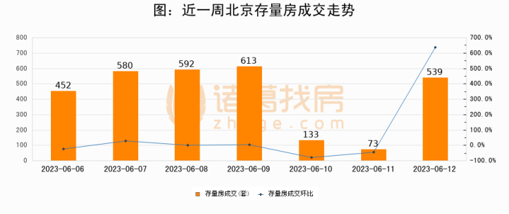 从存量房来看,2023年06月12日北京存量房单日成交539套,比昨日增加466套,环比上涨638.4%。从近一周存量房成交来看,北京存量房日均成交套数为426套,06月12日单日成交539套,高于近一周平均水平26.5%。