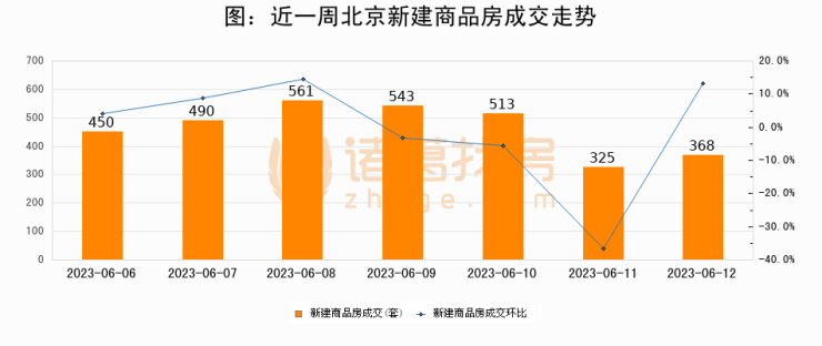 根据北京市住房和城乡建设委员会数据显示,2023年06月12日北京新建商品房成交368套,较昨日增加43套,环比上涨13.2%。近一周北京新建商品房日均成交465套。06月12日单日成交368套,低于近一周平均水平20.9%。