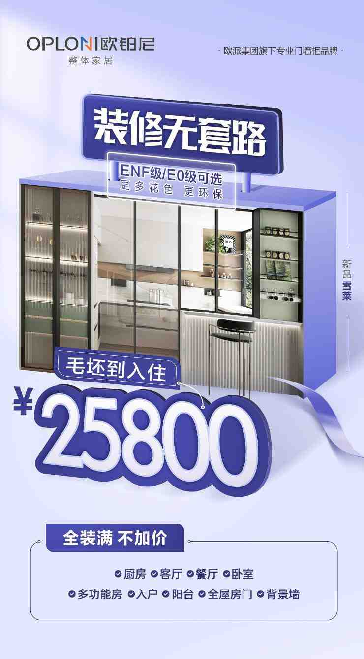 除此之外,欧铂尼通过研究1000+万中国家庭居住需求,潜心打磨“适用优质”的居住体验范本。日前,欧铂尼正式首发整体家居套餐,包括“25800整家定制套餐”、“15800元21㎡超值衣柜套餐”、“7999元7米爆款橱柜套餐”、“9999名牌冰洗热3件套”、“19800家具10件套”等套餐矩阵,一站式满足消费者整屋家装的需求。