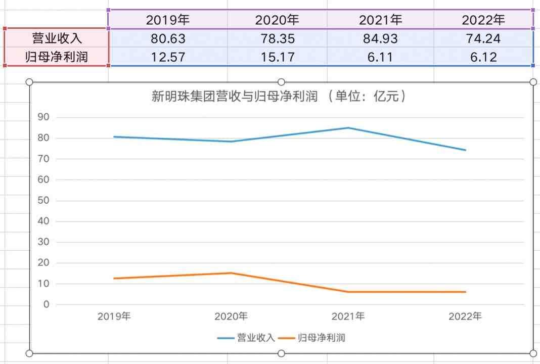 早前公布的招股书显示,新明珠2022年实现总营收74.24亿元,相比2021年的84.93亿元减少了10个亿,同比下滑12.59%;归母净利润6.12亿元,相比前一年基本持平,同比增长0.15%。