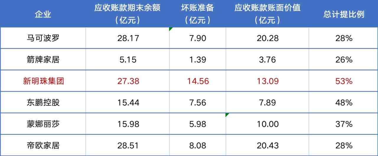 从界面家居测算的针对应收账款的计提比例来看,新明珠的计提比例最高超过50%,其次是东鹏控股(003012.SZ)的48%,第三为蒙娜丽莎(002918.SZ)37%。同时,也仅有新明珠一家的坏账准备超过10个亿。