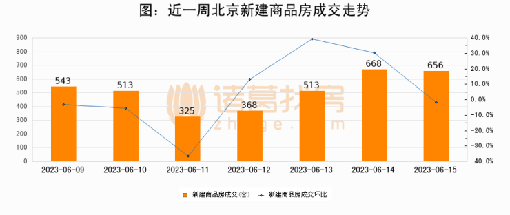 根据北京市住房和城乡建设委员会数据显示,2023年06月15日北京新建商品房成交656套,较昨日减少12套,环比下降1.8%。近一周北京新建商品房日均成交513套。06月15日单日成交656套,高于近一周平均水平27.9%。