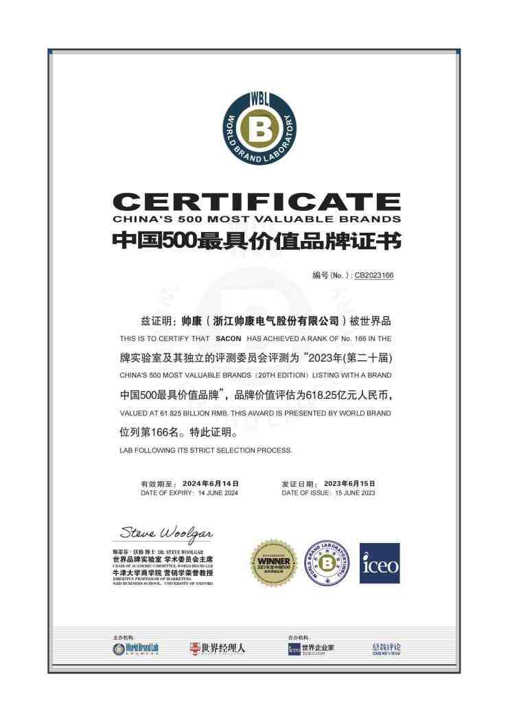 2023年6月15日,由世界品牌实验室和世界经理人联合主办的第二十届世界品牌大会在北京隆重举行,会上发布了2023 年度 (第 20 届)“中国 500 最具价值品牌”榜单。作为中国第一代厨电头部品牌,帅康以618.25亿元的品牌价值连续16年强势入选榜单,位列榜单166位,在专业厨电品牌中位居前列,品牌领跑地位得到行业内外的广泛认可。