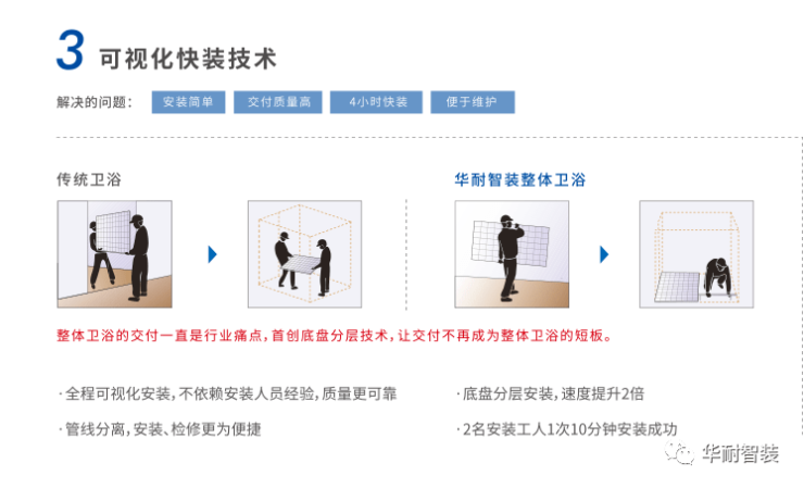 华耐智装用逆向研发解决整体卫浴美观度、耐用性和安装质量等问题,让制造高品质、可持续、健康和耐用的整体卫浴变得容易。建立新的定制交付标准,帮助建筑师、工程师、建造师和业主能体验到华耐智装整体卫浴的价值。