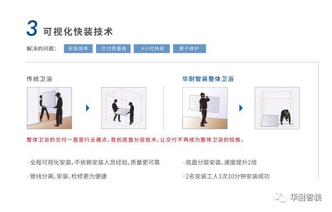 相比传统卫浴,华耐智装整体卫浴真正实现了“从拖泥带水到干净利落”。我们不仅将这一理念应用到整体卫浴产品本身,也应用在我们的工作流程中,能够“干净利落”地帮助客户解决问题,为用户提供更优质的产品及服务。