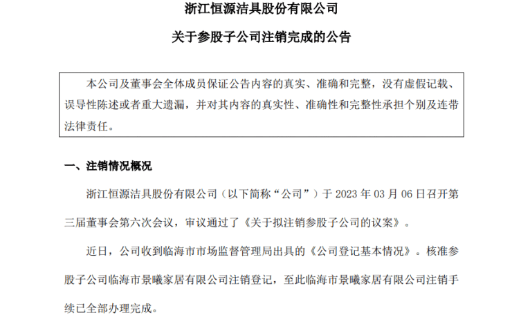2023年4月13日,恒源洁具(871008)公告称,公司于2023年3月6日召开第三届董事会第六次会议,审议通过了《关于拟注销参股子公司的议案》。公司近日收到临海市市场监督管理局出具的《公司登记基本情况》,核准参股子公司临海市景曦家居有限公司注销登记,至此临海市景曦家居有限公司注销手续已全部办理完成。