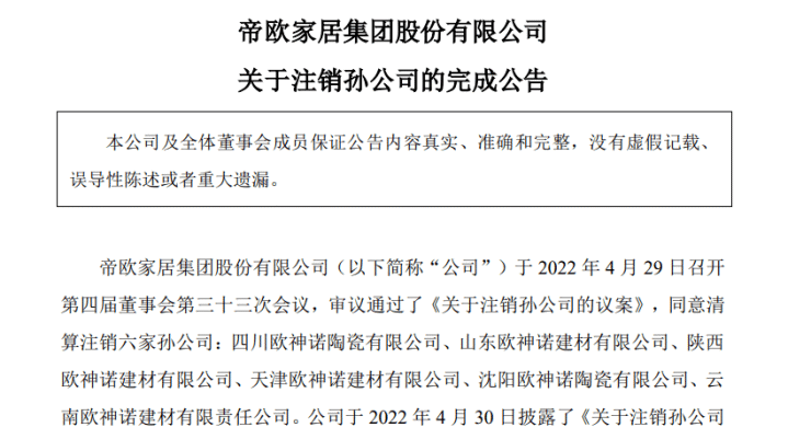 值得注意的是,帝欧家居曾于4月29日公告称,董事会同意清算注销四川欧神诺陶瓷有限公司、山东欧神诺建材有限公司、陕西欧神诺建材有限公司、天津欧神诺建材有限公司、沈阳欧神诺陶瓷有限公司、云南欧神诺建材有限责任公司等六家孙公司。