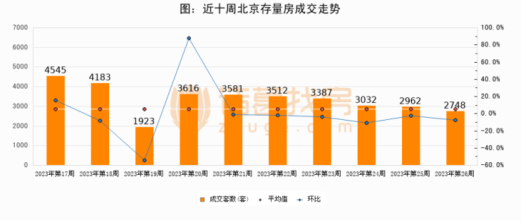 存量房方面,第26周北京存量房成交2748套,较上周减少214套,环比下降7.2%。从近十周成交走势来看,周均成交套数为3348套,本周低于平均水平17.9%。