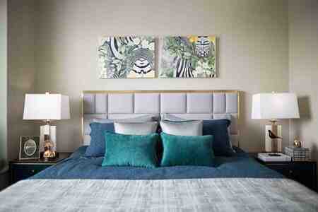 柜子与床头、挂画与垫脚椅、条纹枕与被罩,相同颜色让空间中的所有物品从颜色层面上贯穿起来,并协调统一。这种配色手法不仅非常简单,也很直观。