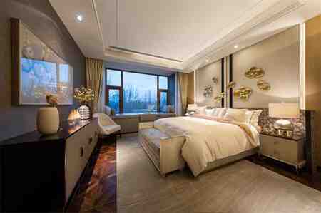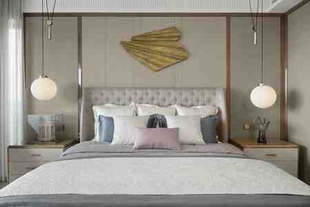 左侧图中的左右墙面呈现给大家的是重色,然后床头的背景墙是浅色或者直接用白色空出来。这样两边的深色会形成一种挤压的感觉,显得这个房间更加狭长。