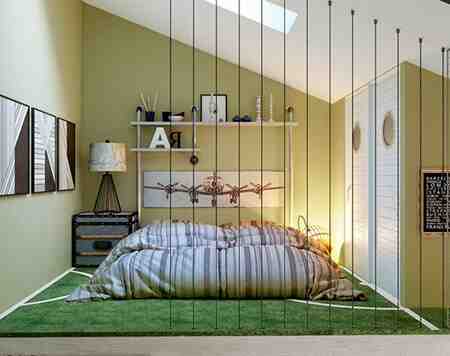 所以采用了上墙重色、下墙浅色的色彩处理,并巧妙地利用了空间的整体结构(白色部分其实是房间内的楼梯)。通过色彩将结构区分开也是一种不错的选择。