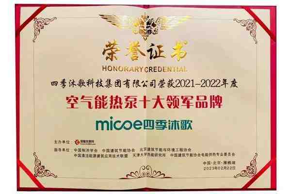 2023年,四季沐歌荣膺”空气能热泵十大领军品牌”,展现了其持续发展和专业实力。这一成就源于四季沐歌来对空气能技术的深入研究和不断创新。自2003年开始专注于空气能领域,四季沐歌已经致力于空气能的研发已有20年,同时也自主生产热泵产品已有11年。通过持续的努力和耕耘,四季沐歌在空气能领域取得了显著的成绩,获得了业界的广泛认可。这一荣誉再次证明了四季沐歌在行业中的专业地位。
