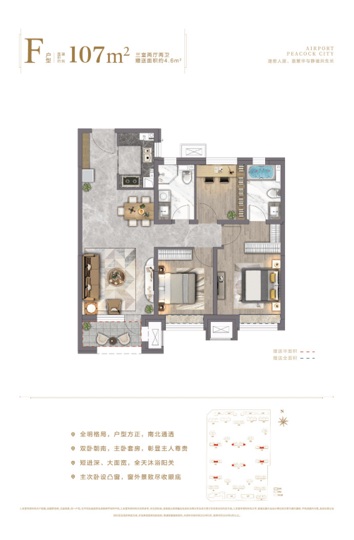 107㎡户型同样是动静分区,而且还是全明户型哦,室内各功能区间都是方方正正的。父母带娃或者小两口带娃住这个都是不错的选择,三间卧室一间主人房一间老人房,一间儿童房。小两口带孩子那就两个南向卧室居住,北向的卧室作为工作室或者孩子的学习屋都可以。客厅的设计和83㎡的设计一样,但面积更大,使用起来空间感更强了。