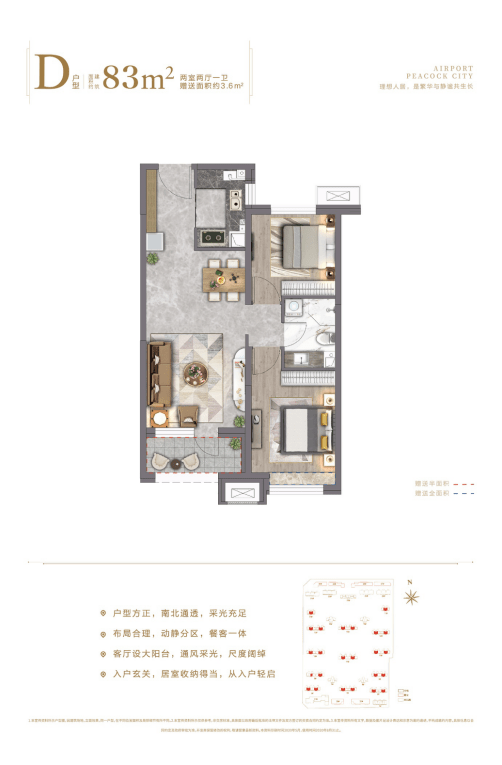 建面83㎡的景点户型是很经典的户型满足2口人或者刚有娃的家庭,动静分区设计在80-90㎡面积段已经少见了。户型方正,卫生间的位置可以方便两个卧室的起居使用,中间户的户型做到了明厨设计,并且在厨房与餐厅之间的隔墙是可以修改的,开放厨房+中西厨的设计在83㎡户型也可以满足。南向阳台+飘窗这个相当给力了,北京大部分都是飘窗,阳台已经近乎绝版,在这里不仅有飘窗还有阳台面积,功能空间更加完善。
