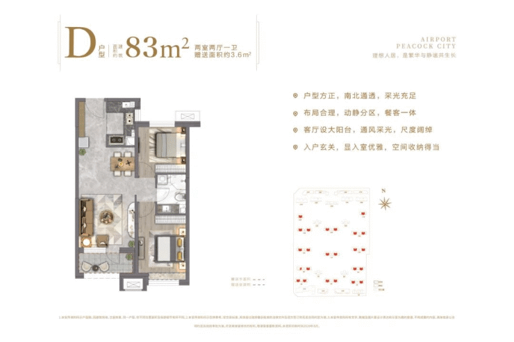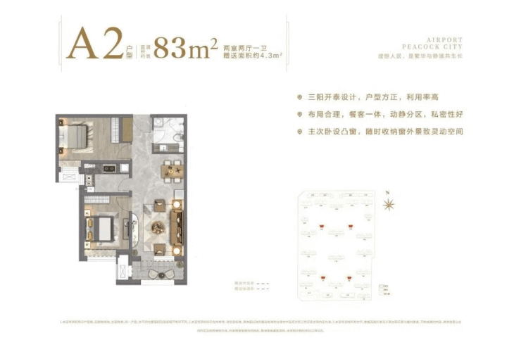 81-83㎡的两居室特别适合,总价约105万起,首套首付约21万起,户型有全南向大面宽,还有经典的南北通透户型。