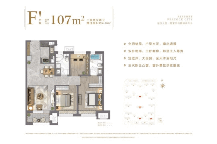 107㎡户型对于需要三代同堂的家庭很有实用性,超性价比的功能三居室,总价约140万起,首套首付约27万起。