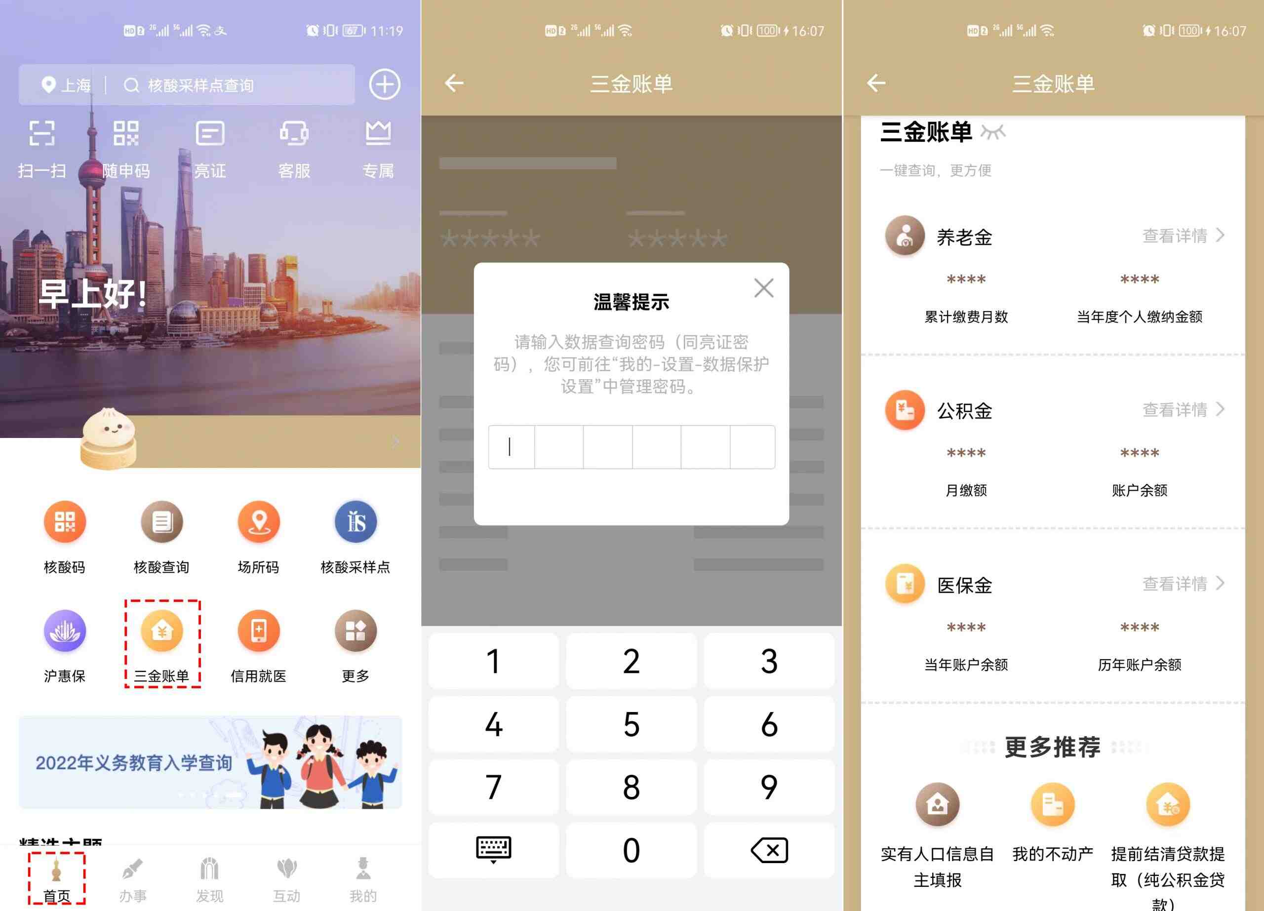 市民实名登录“随申办市民云”APP→点击首页的“三金账单”,进入服务页面后即可实时查询你的“公积金”、“医保金”及“养老金”个人账户资金账单