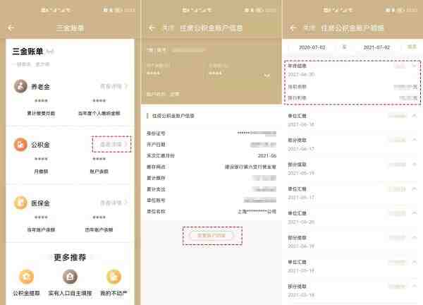 进入“三金账单”服务页面→点击“公积金”的“查看详情”→点击“查看账户明细”