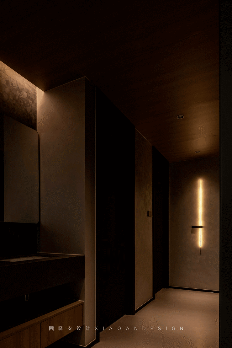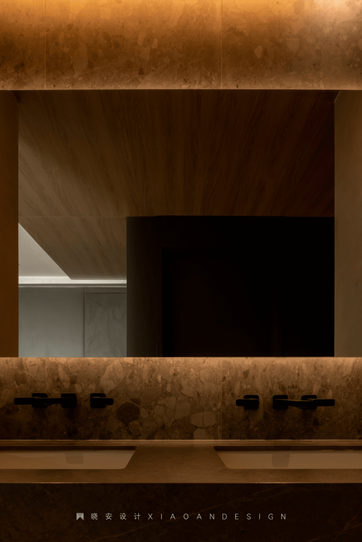 克制又冷静的美感,贯穿整个公共场域。在这样沉稳的旋律下,突破性地融合过道与洗手台,促使空间结构与功能展开相互依存的妙趣。几何镜面拓展了视觉层次,看似冰冷的空间中,光线和原木携手舒缓了空间氛围,让转角氛围满满。