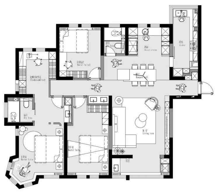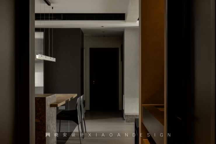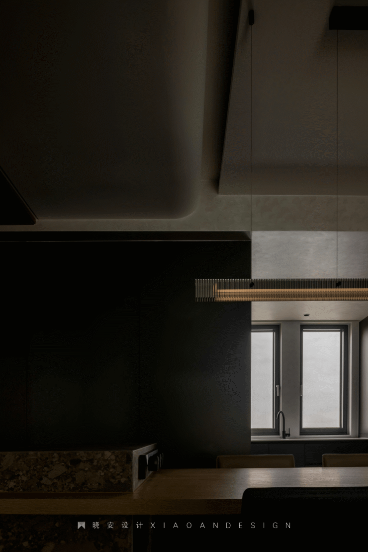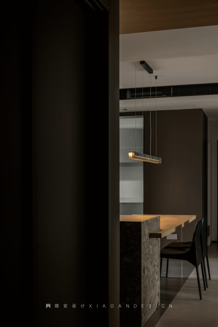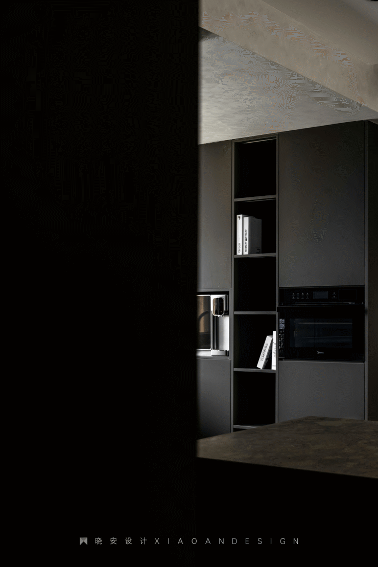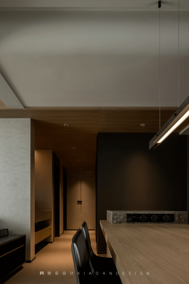 南北通透,西厨、餐厅、客厅之间未设隔阂,最大化地引入自然光。整个空间围绕“无色胜有色”的理念,材质上以柔光砖、艺术漆为主,为居住者构建黑白灰的纯粹世界。原木色游走在顶面,调和了视觉温度,为空间注入无限生机。