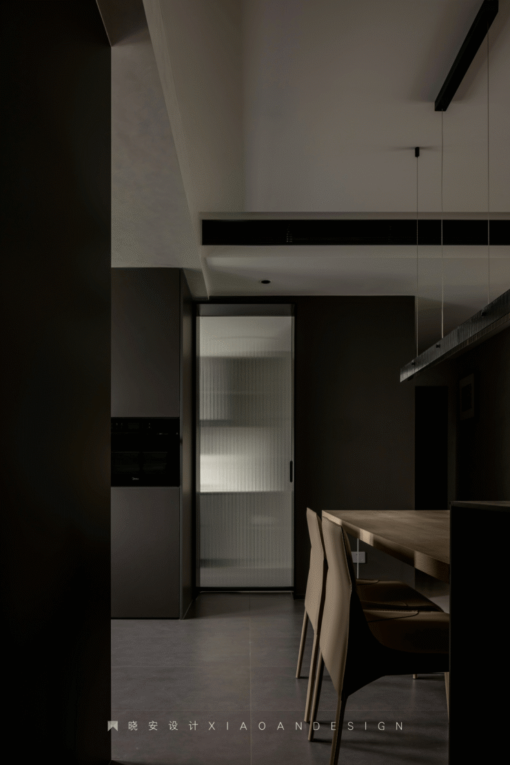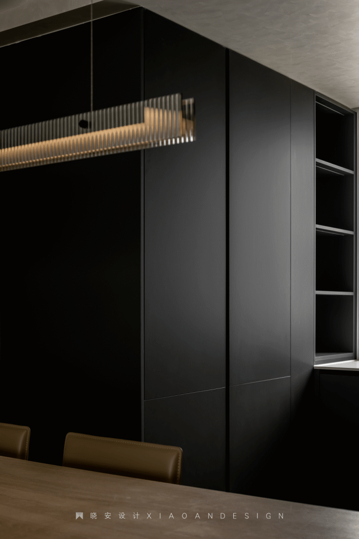 黑色贯穿整个空间,大面积的黑色饰面,让人在进入空间后能迅速安定下来,静下来就会发现设计的韵脚和节奏,空调风口、磁吸灯槽、落地灯、厨房移门边框、餐椅等,一切易被忽视的细节都被黑色无声联动。