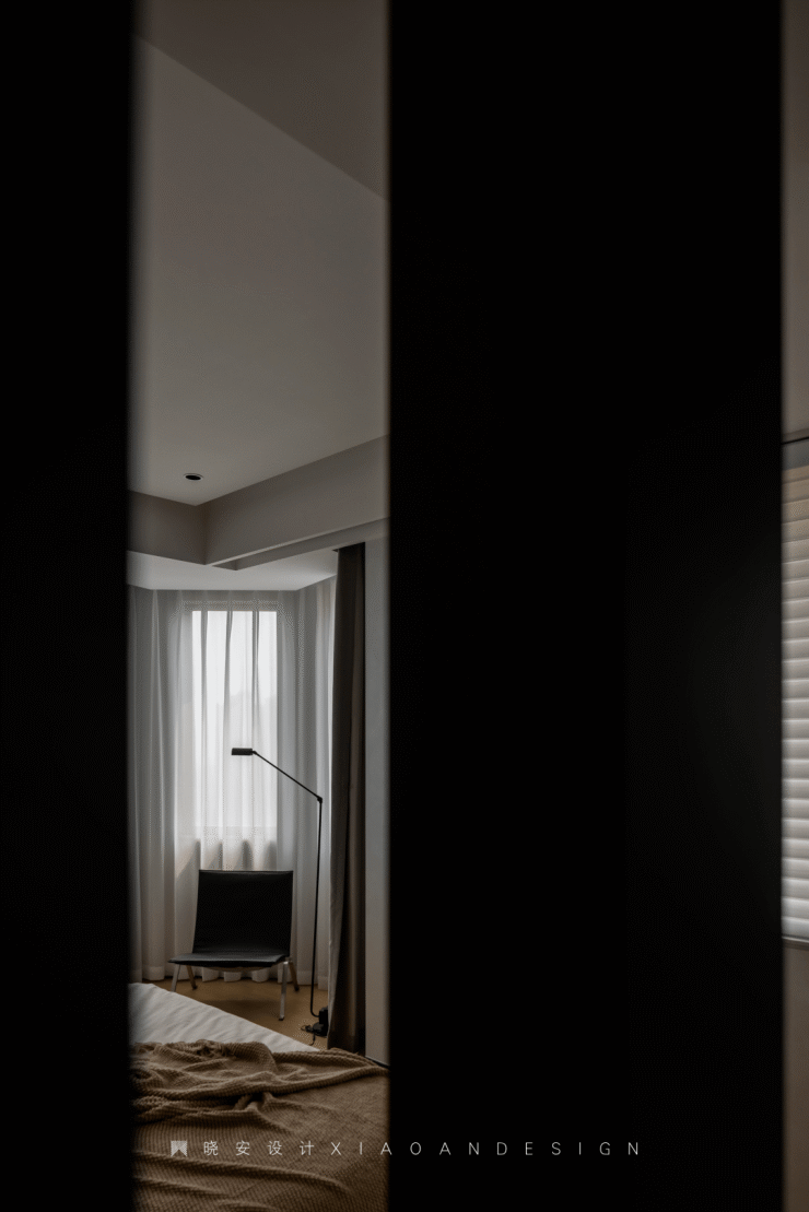 隔断携手镂空观感与内凹弧面,拉近了睡卧区与洗漱区的距离,床头边界处散发的光晕与洗漱区的暖光呼应,缓和了暗光区的冷感。异形窗切分观景画面,一把椅,一盏灯,即可享受休闲时光。