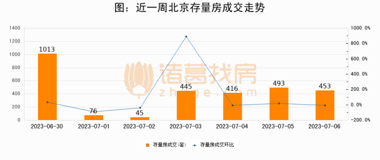 从存量房来看,2023年07月06日北京存量房单日成交453套,比昨日减少40套,环比下降8.1%。从近一周存量房成交来看,北京存量房日均成交套数为420套,07月06日单日成交453套,高于近一周平均水平7.9%。