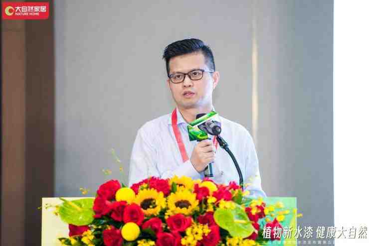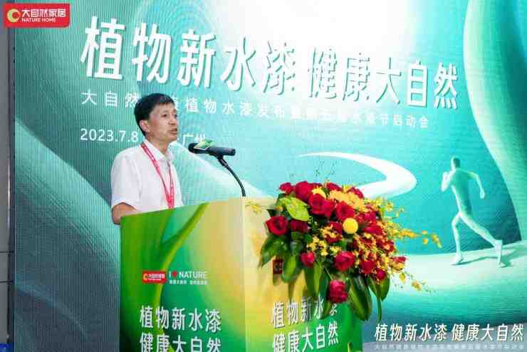发布会现场,中国建博会负责人杨华伟在致辞中表示,大自然家居本次使用健康植物水漆,更好地践行了双碳战略,将再一次推动产业的绿色升级。