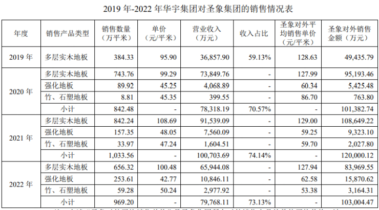 2022年因经济环境影响,房地产行业整体销售出现下滑,导致圣象集团对华宇集团多层实木地板提货量大幅减少,华宇集团营业收入下滑19.69%。2022年华宇集团对圣象集团的平均销售价格是下降的,圣象集团对外销售地板的数量和平均价格也是下降的。