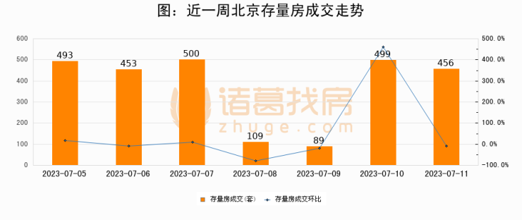 从存量房来看,2023年07月11日北京存量房单日成交456套,比昨日减少43套,环比下降8.6%。从近一周存量房成交来看,北京存量房日均成交套数为371套,07月11日单日成交456套,高于近一周平均水平22.9%。