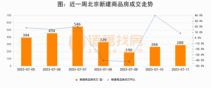 根据北京市住房和城乡建设委员会数据显示,2023年07月11日北京新建商品房成交288套,较昨日增加22套,环比上涨8.3%。近一周北京新建商品房日均成交353套。07月11日单日成交288套,低于近一周平均水平18.4%。