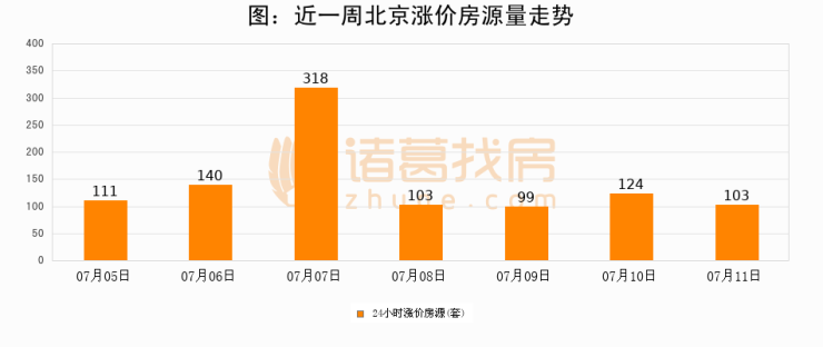 根据诸葛找房数据显示,北京24小时涨价房源量为103套,较07月10日减少21套,环比下降16.9%。与此同时,涨价房源占比小幅回落,对于购房者来说是一个入市窗口期,购房者可抓住时机入市。