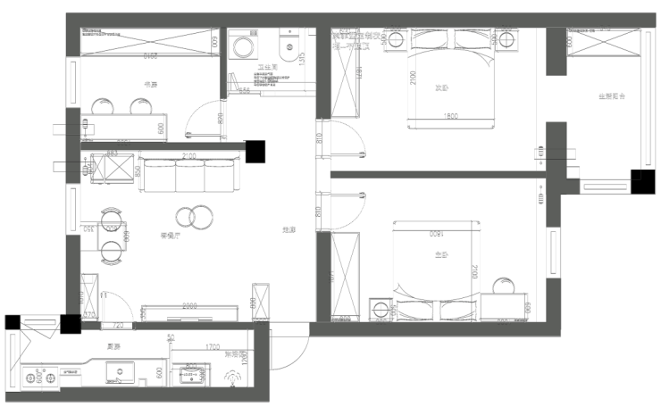原始卫生间较小,在不浪费三室的情况下,将利用率较低的淋浴间移到厨房,卫生间实现干湿分离,一字型厨房也不会过于狭长,一举两得。