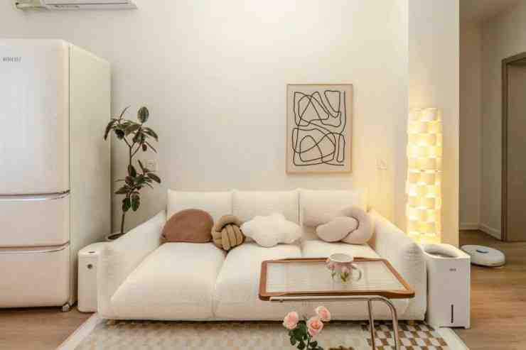 客厅不做复杂吊顶,简简单单的双眼皮石膏线,四周刷上奶油色墙漆,配上白色沙发、格子地毯、暖色的落地灯,奶乎乎的氛围感就出来了。