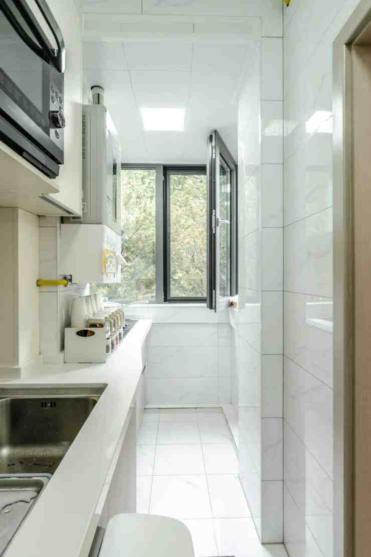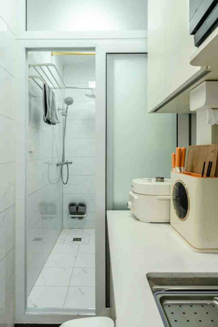 ▶打通厨房阳台,挪动灶台,隔出一个「淋浴间」