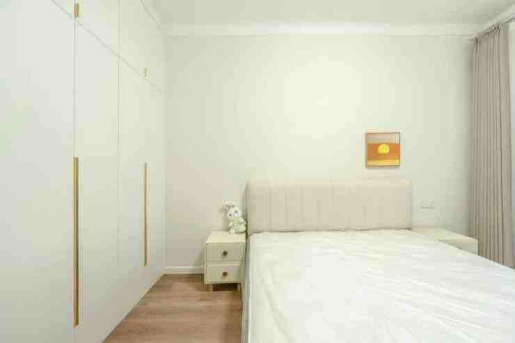 主卧做了双开门的大衣柜,收纳力max。软包床头,柔软舒服,床头的日落挂画有种「我在人间贩卖日落」的feel。