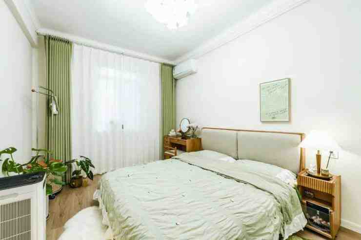 次卧整体选择黑胡桃木+清新绿的春日色系,化妆桌、床头柜都是深色的黑胡桃木家具,高级有质感,搭配绿色的窗帘、地毯,干净清新。