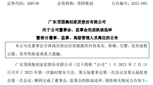 本次董事会换届工作完成,林新达先生不再担任公司董事长及总经理,继续担任董事、董事会提名委员会委员及在公司担任终身名誉董事长、智能家居研究院院长和顶固学院院长等相关职务。林新达卸任董事长及总经理后,女婿辛兆龙接棒,担任公司董事长兼总经理。