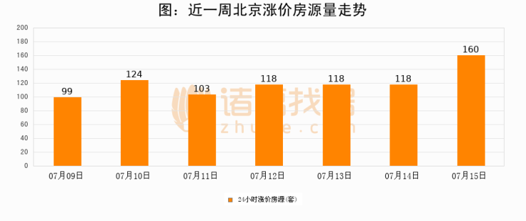 根据诸葛找房数据显示,北京24小时涨价房源量为160套,较07月14日增加42套,环比上涨35.6%。与此同时,涨价房源占比小幅扩大,业主信心有所提升。