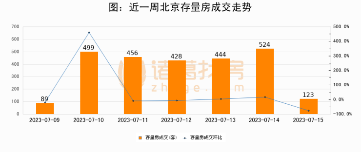 从存量房来看,2023年07月15日北京存量房单日成交123套,比昨日减少401套,环比下降76.5%。从近一周存量房成交来看,北京存量房日均成交套数为366套,07月15日单日成交123套,低于近一周平均水平66.4%。