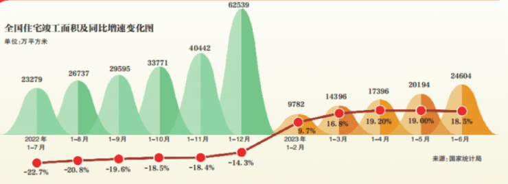 从全国来看,相比于去年,今年的房屋累计竣工面积也都保持着正向增长。根据国家统计局公布的数据,2023年1-6月,全国房屋竣工面积33904万平方米,增长19.0%。其中,住宅竣工面积24604万平方米,同比涨幅为18.5%。