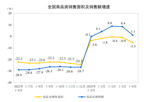 1-6月商品房销售面积和销售额增速分别为-5.3%和1.1%。