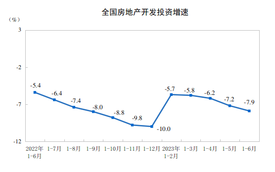 1-6月房地产开发投资累计同比增长-7.9%,较1-5月下降0.7个百分点。